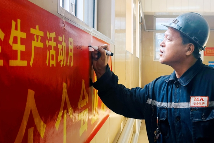 • 東山礦職工在安全生產承諾條幅上簽名。 李雪攝